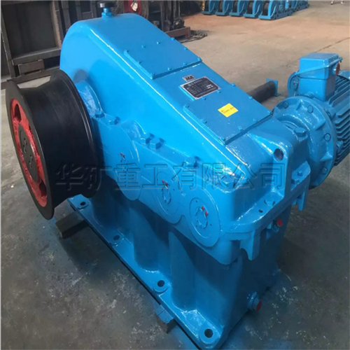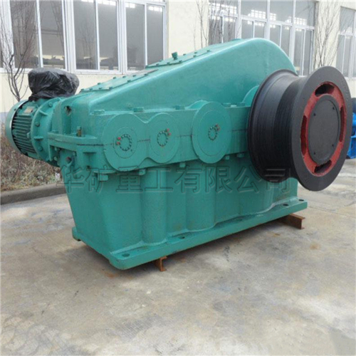 調(diào)車絞車適用于煤礦、選煤廠、電廠、冶金礦場、鋼鐵廠、水泥廠、港口等場所調(diào)度列車之用。該絞車為無機繩摩擦式傳動,與導(dǎo)向輪、托滾、壓滾、滑車等輔機配套組成列車系統(tǒng)。調(diào)車絞車系統(tǒng)可以實現(xiàn)正反雙向重載牽車。絞車由電動機、聯(lián)軸器、制動器、減速器以及摩擦輪等幾部件分組成。電機采用變頻電機,配以變頻電控柜,可以實現(xiàn)無機變速,重載時采用低速恒扭矩啟動、頻率在5~50H范圍內(nèi)可調(diào),空載時采用高速恒功率運行、使絞車運行速度快、效率高、頻率在50~80Hz范圍內(nèi)可調(diào)。減速器采用雙圓弧齒輪傳動,具有傳動比大、體積小、傳動效率高、噪音低、承載能力強等優(yōu)點。電機與減速器之間采用帶制動輪的聯(lián)軸器,制動器為手動、自動2用,使制動更安全可靠。摩擦輪采用高牌號鑄鋼件,機械強度高、耐磨性能好、使用壽命長。摩擦輪與減速器輸出軸采用脹套聯(lián)系,安裝拆卸方便。絞車主機用鋼絲繩與輔機連成牽車系統(tǒng),輔機包括導(dǎo)向輪、壓滾、托輪、滑車、支持輪、重垂、重垂架等配件。鋼絲繩在主機摩擦輪上纏繞四圈后穿過導(dǎo)向輪、壓滾、滑車,兩頭固定。托滾放置在鋼絲繩下方起襯托作用,重垂通過支架輪將滑車張緊,使鋼絲繩始終有一定的張緊力,保證鋼絲繩在摸查輪上產(chǎn)生足夠大的摩擦力,以拉動整列車火車。整個工作過程如下∶電機啟動、驅(qū)動減速器、使摩擦輪傳動,通過摩擦力使鋼絲繩運動。改變電機的轉(zhuǎn)動方向?qū)⒏淖兞熊嚨倪\動方向,一達(dá)到調(diào)運列車的需要調(diào)車絞車分為單摩擦輪調(diào)車絞車 雙摩擦輪調(diào)車絞車及四摩擦輪調(diào)車絞車又分為裸露摩擦輪和隱藏摩擦輪。就安全因素而言,隱藏式摩擦輪結(jié)構(gòu)更為安全