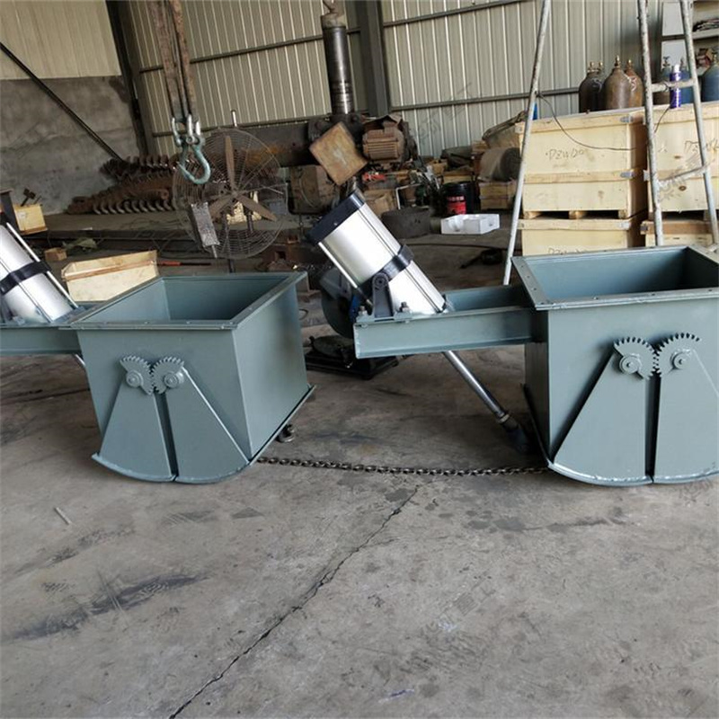 電液動扇形閘門采用電液推桿作為驅(qū)動,也可選用電動推桿或氣缸作為動力源。電液動扇形閘門工作時由電液推桿的伸縮帶動扇形閘板沿軸心旋轉(zhuǎn),使扇形閘板向一邊開啟,物料隨即下落,待接料裝置滿載后,再由電液推桿驅(qū)動使扇形閘板復(fù)位,關(guān)閉截斷下落的物料。