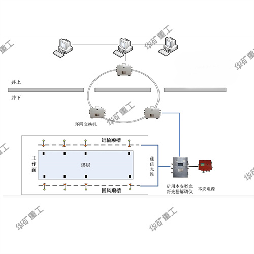 2、系統(tǒng)根據(jù)采場(chǎng)地質(zhì)條件采用了兩級(jí)總線設(shè)計(jì),總線之間完全隔離,工作面和巷道數(shù)據(jù)無線采集傳輸。